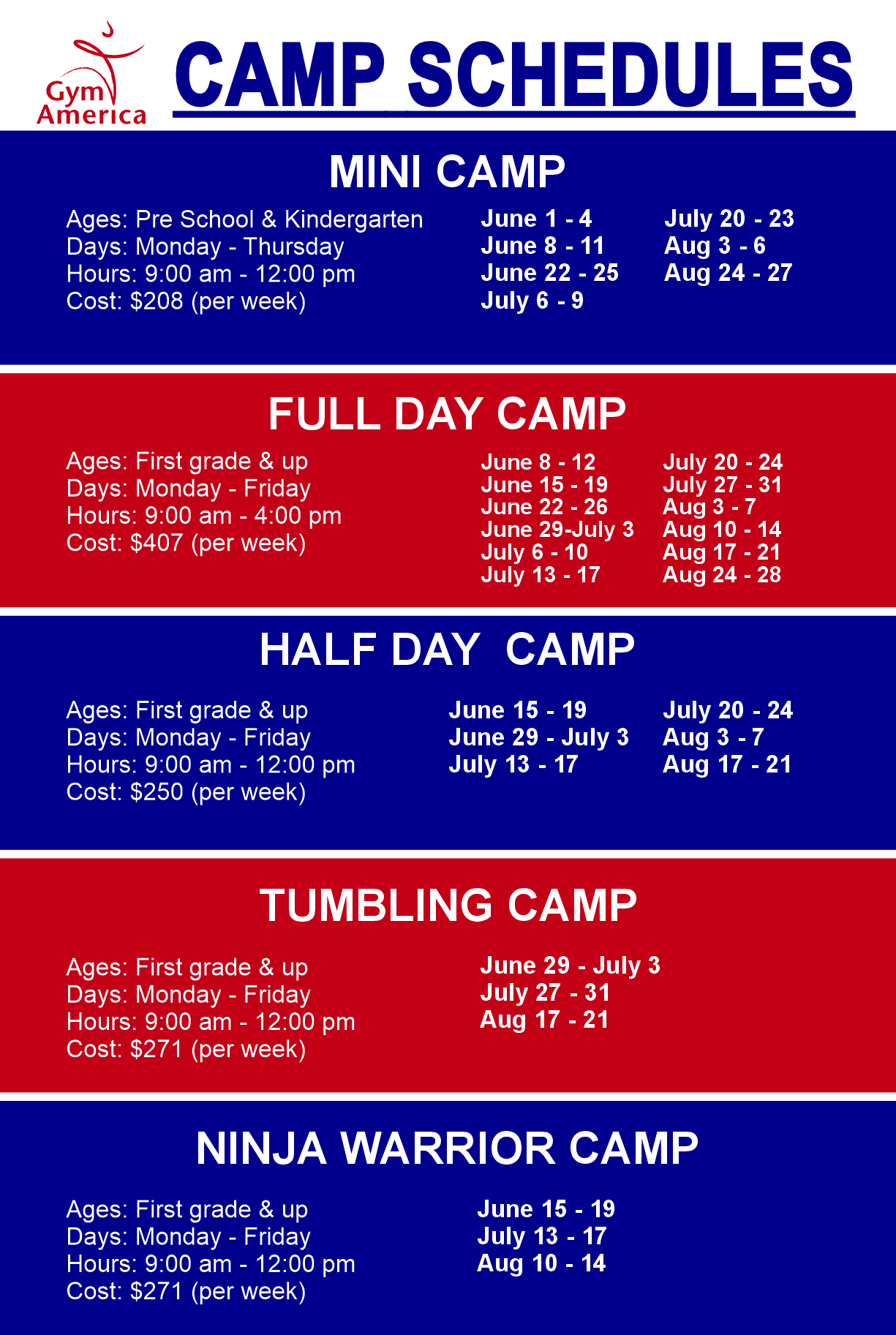 Our campers have a blast learning gymnastics, making memories, and participating in our camp enrichment activities. We offer half-day camps as well as full-day camps every week during summer. Camps are open to school-age children and preschoolers.